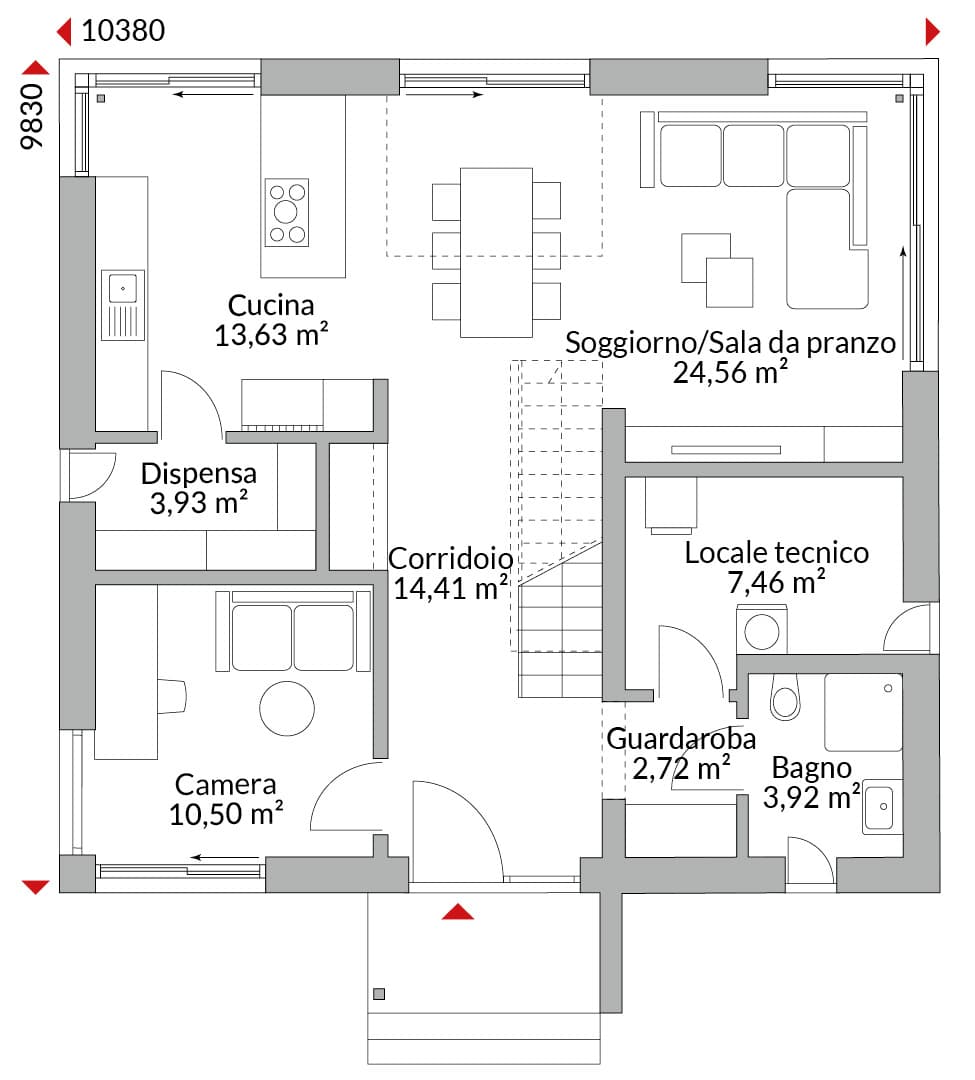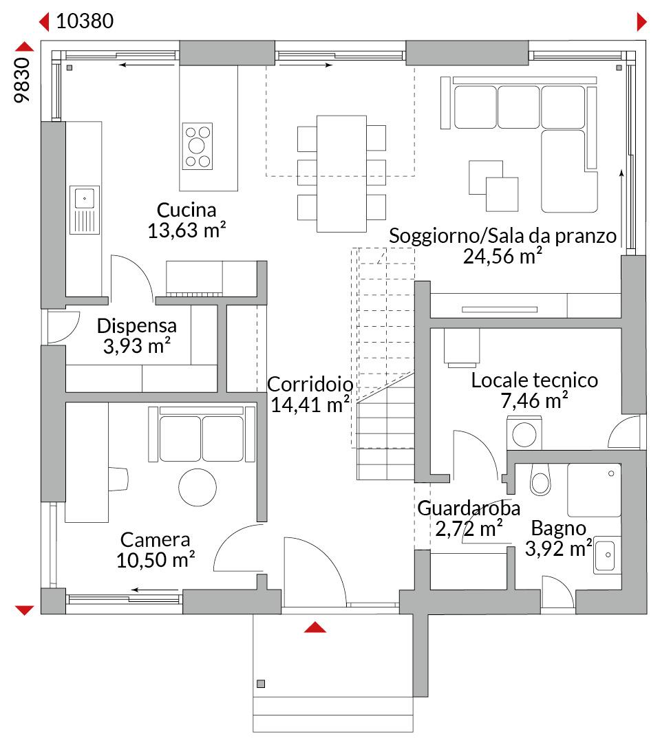 Casa con mansarda abitabile, pensilina sopra la porta d’ingresso preceduta da alcuni gradini e tre camere al piano superiore. Camera da letto con cabina armadio. Ampie vetrate a tutta altezza con balconcini alla francese, bagno con vasca, doccia e doppio lavabo. Al piano terra, camera per gli ospiti con bagno privato dotato di doccia e WC. Piano terra rialzato con ampie vetrate d’angolo, concepito come open space con cucina a vista e finestra angolare, e zona soggiorno/pranzo con porte scorrevoli che conducono alla terrazza. Dispensa, locale tecnico, ingresso con zona guardaroba e disimpegno. Tetto a due falde con ampi sporti di gronda (60 cm), pendenza di 40° Altezza muro sotto falda: 1,00 m.