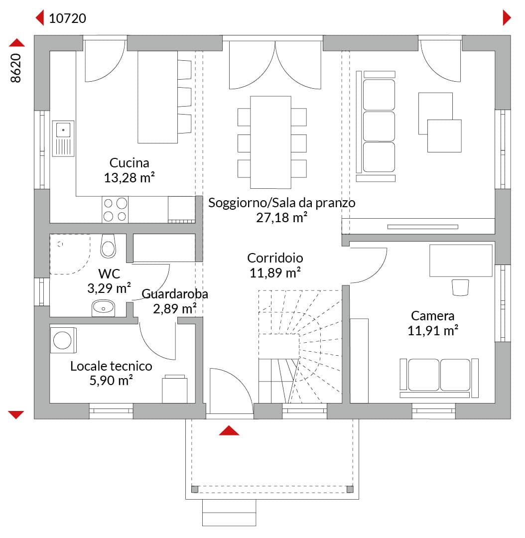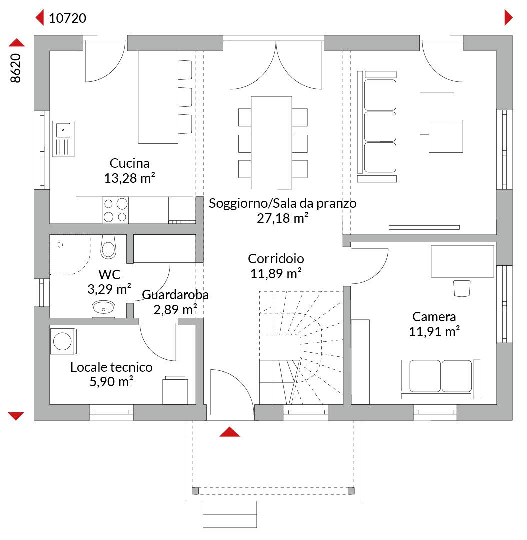 Casa con mansarda abitabile con un abbaino trasversale, balcone, veranda, cinque camere da letto, cucina open space, bagno, bagno di cortesia, locale tecnico e ingresso. Tetto a due falde con pendenza di 40° (tetto a due falde trasversale 35°). Altezza muro sotto falda: 0,75 m. Facciata standard con intonaco bianco.