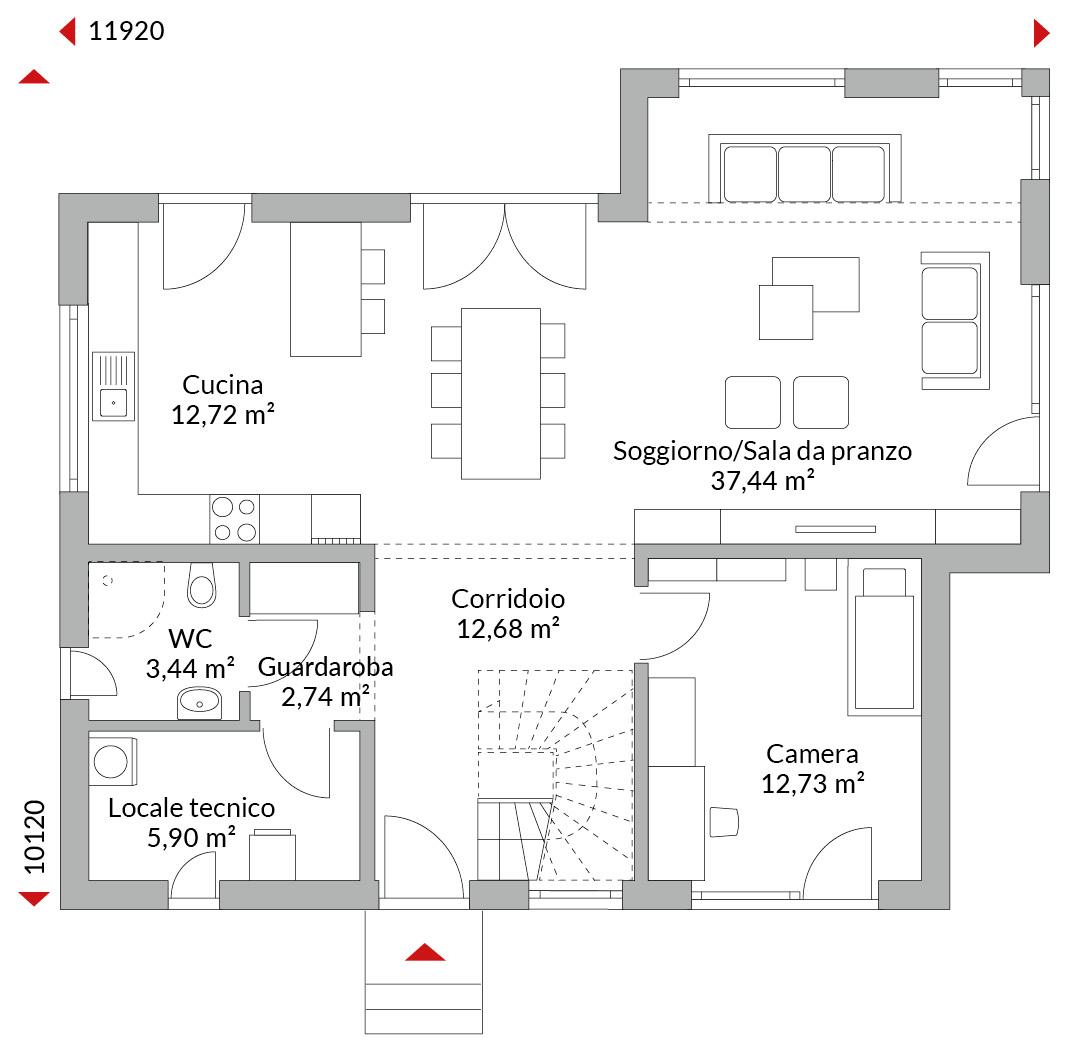 Casa con mansarda abitabile con cinque camere, cabina armadio, cucina open space, dispensa, bagno, bagno di cortesia, ingresso, zona guardaroba, disimpegno e locale tecnico. Tetto a due falde con pendenza di 30°. Altezza muro sotto falda: 1,50 m.
