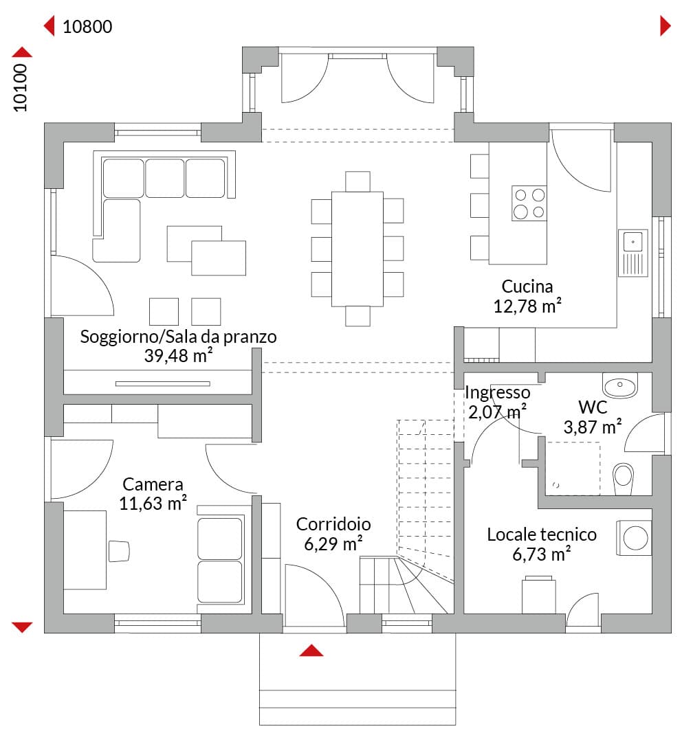 Casa con mansarda abitabile con cinque camere, cabina armadio, cucina open space, bagno, bagno di cortesia, locale tecnico, ingresso e disimpegno. Tetto a due falde con pendenza di 35°. Altezza muro sotto falda: 1,25 m. Con bovindo e balcone.