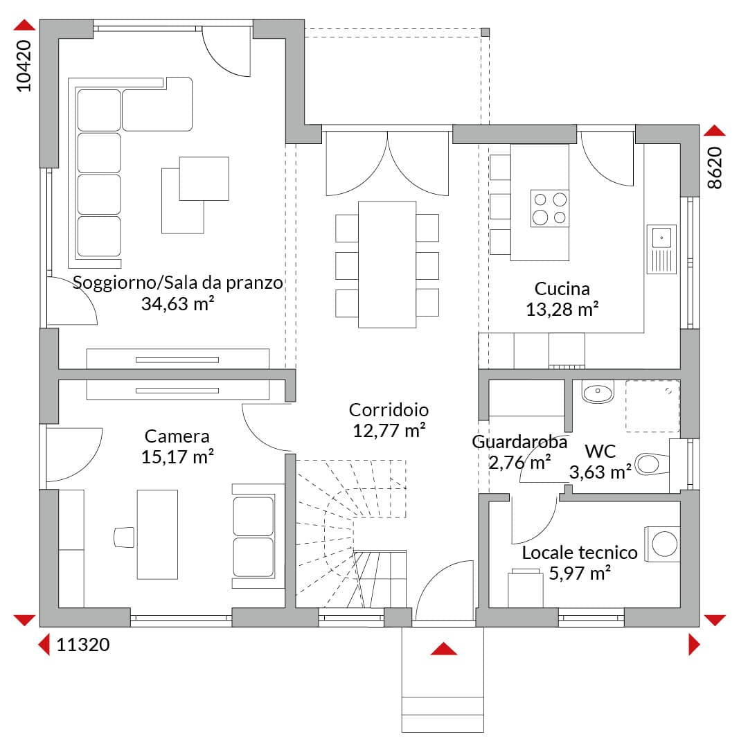 Casa con mansarda abitabile a tre abbaini, con cinque camere da letto, cabina armadio, cucina open space, bagno, bagno di cortesia, ingresso, disimpegno e locale tecnico. Tetto a due falde con pendenza di 40°. Altezza muro sotto falda: 0,75 m. Con terrazza coperta.