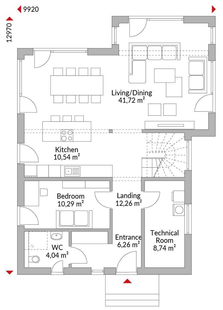 Casa con mansarda abitabile con cinque camere, cabina armadio, cucina open space, bagno, bagno di cortesia, locale tecnico, ingresso e disimpegno. Tetto a due falde con pendenza di 35°. Altezza muro sotto falda: 1,75 m.