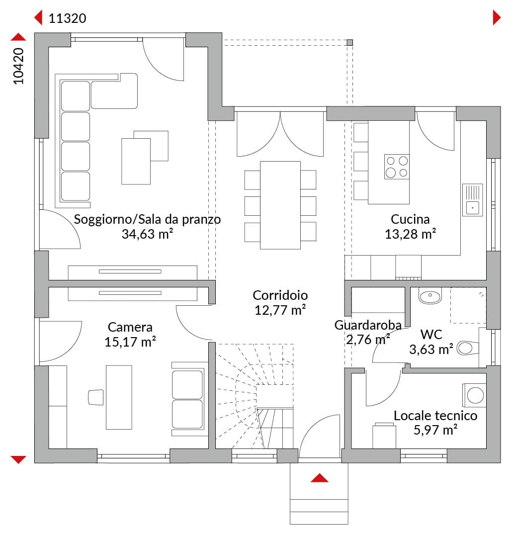 Casa con mansarda abitabile con tre abbaini, sei camere, cucina open space, bagno, bagno di cortesia, zona guardaroba, ingresso, disimpegno, cabina armadio e locale tecnico. Tetto a due falde con pendenza di 38° . Altezza muro sotto falda: 1,00 m.