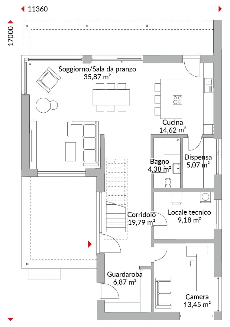 Casa a due piani con copertura perimetrale della terrazza e ampia pensilina sopra la porta d’ingresso rialzata; tre camere da letto al piano superiore; camera padronale con cabina armadio e bagno con vasca, doppio lavabo e doccia; secondo bagno al piano superiore con doccia; locale multifunzionale separato al piano terra; piano terra rialzato con vetrate d’angolo a tutta altezza nel soggiorno, concepito come zona giorno open space con cucina/pranzo/soggiorno e porte scorrevoli verso la terrazza; dispensa; locale tecnico; disimpegno con guardaroba; bagno di cortesia con doccia; altezza muro sotto falda di 210 cm; tetto a due falde con inclinazione di 36°.