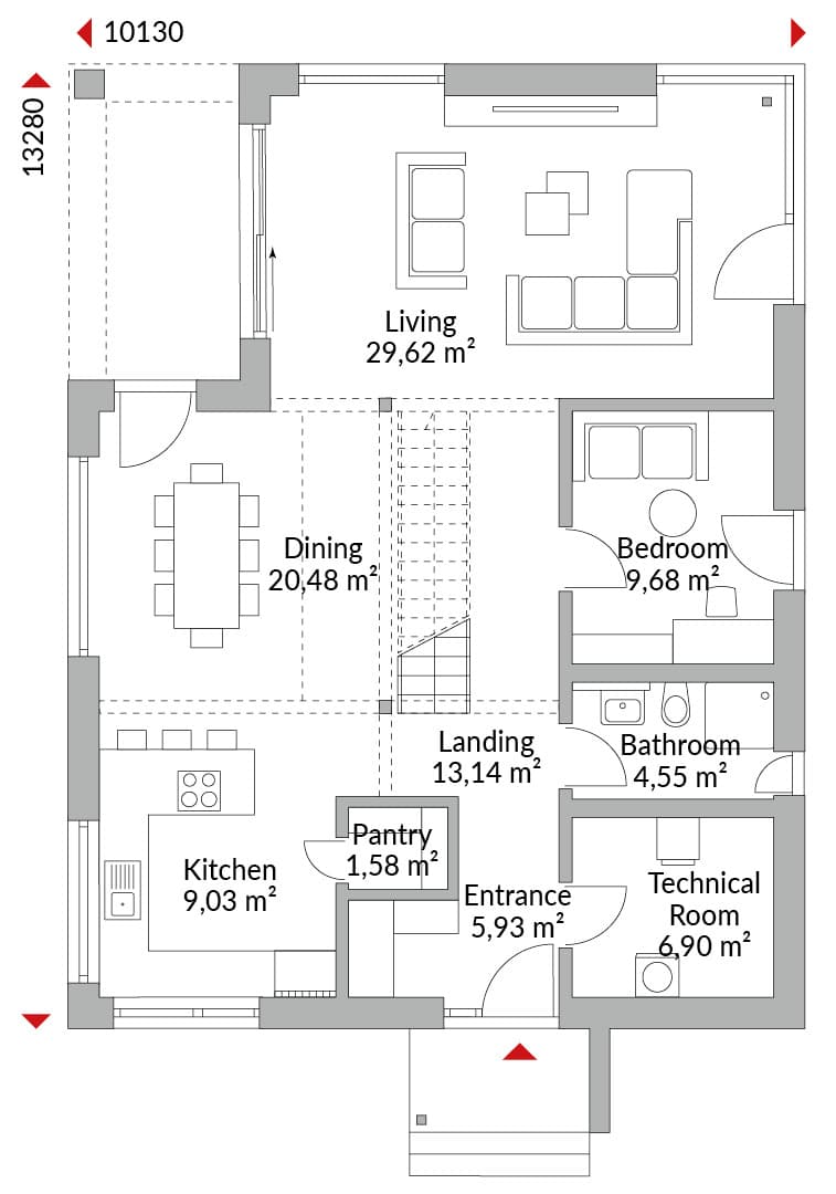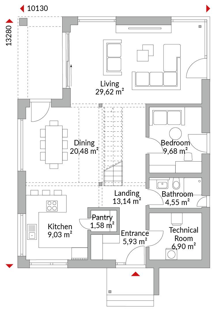 Casa con mansarda abitabile con ingresso coperto e porta d’ingresso rialzata, posta sul lato corto. Piano terra rialzato con finestre a tutta altezza e cucina open space con dispensa, collegata in modo fluido alla zona giorno e pranzo adiacente. La zona pranzo e il soggiorno godono entrambi di un’ampia vetrata d’angolo, mentre l’area living dispone anche di porte scorrevoli che si aprono su terrazzo e giardino. Ambiente aggiuntivo utilizzabile come studio o come camera per gli ospiti. Il piano terra comprende anche bagno di cortesia, locale tecnico, ingresso e disimpegno. Al piano superiore si trovano tre camere da letto e un pianerottolo aperto in stile galleria, che dona ampiezza e luminosità agli spazi. Una delle camere dispone di bagno privato e cabina armadio. Un ulteriore bagno con doccia e un ripostiglio completano il piano superiore. La casa è dotata di tetto a due falde con ampi sporti (60 cm) e inclinazione di 35°. Altezza muro sotto falda: 1,25 m.