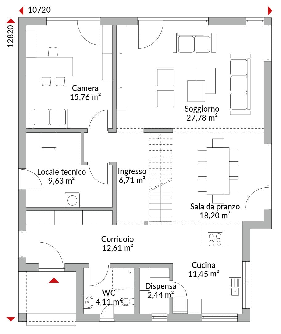 Casa con mansarda abitabile con sette camere da letto, cabina armadio, galleria, cucina open space, dispensa, bagno, bagno di cortesia, ingresso, disimpegno e locale tecnico. Tetto a due falde con pendenza di 30°. Altezza muro sotto falda: 1,25 m. Con ingresso coperto.