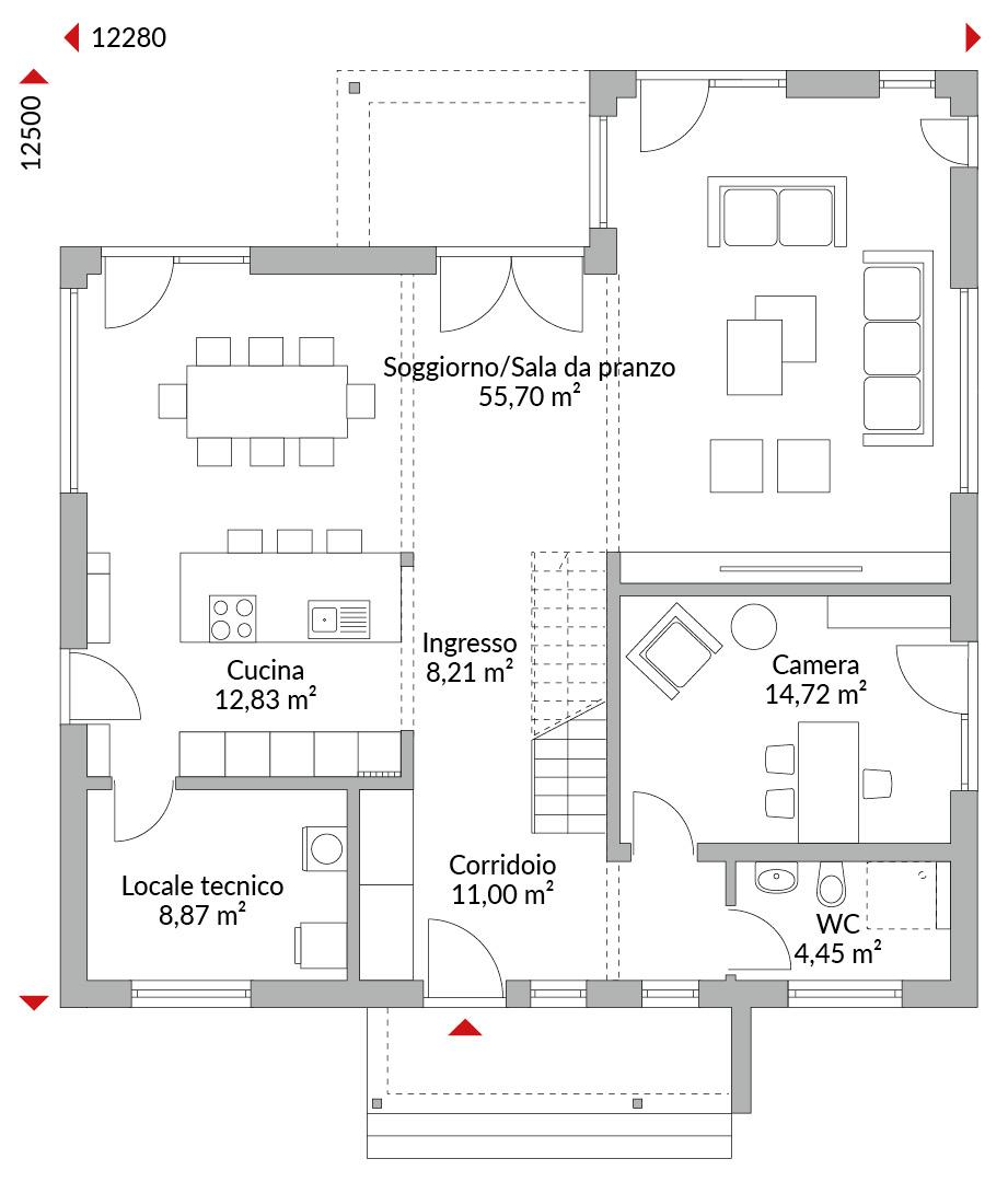 Casa con mansarda abitabile con sei camere, due cabine armadio, cucina open space, bagno, bagno di cortesia, locale tecnico, ingresso e disimpegno. Tetto a due falde con pendenza di 25°. Altezza muro sotto falda: 1,75 m.
