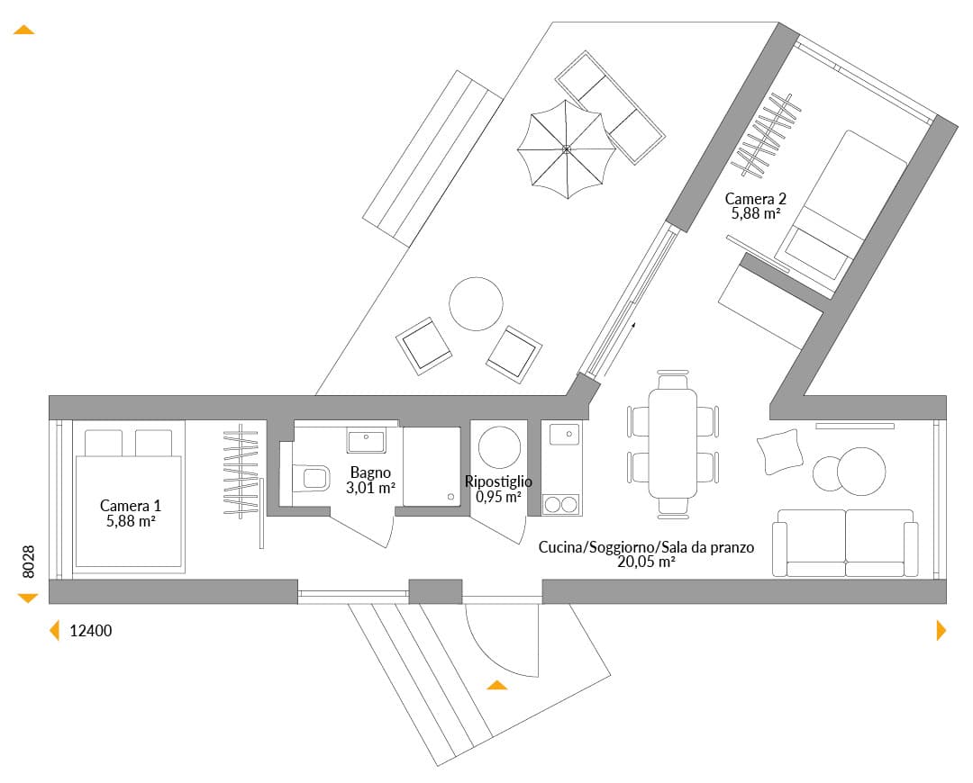Più spazio, più divertimento La bellezza delle case modulari è la loro espandibilità: se si necessita di stanze extra, possono essere aggiunte. Questo è particolarmente utile nel caso di una seconda camera da letto e di un capiente armadio aggiuntivo. Dopotutto, per quattro persone – o addirittura per un massimo di sei – è necessario un po' più di spazio per vivere e riporre le cose. E nonostante i moduli S siano stretti, c'è comunque spazio per un grande tavolo dove mangiare e giocare insieme. L'aggiunta dell'ala laterale offre anche una terrazza protetta dal vento, un elemento permanente che è come avere una veranda coperta.