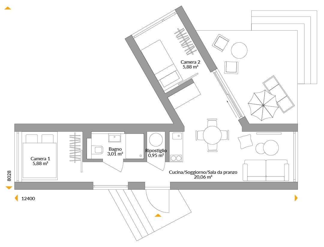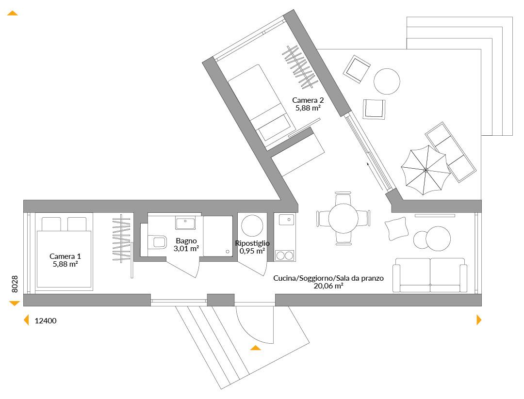 Compatta ma spaziosa: questa elegante casa vacanze NEXT, con il suo rivestimento in doghe dal tono naturale, offre quasi 36 m². È costruita utilizzando moduli S stretti, ma c'è comunque spazio per una seconda camera da letto grazie all'ala aggiuntiva ancorata. Questa soluzione aumenta anche lo spazio per i ritrovi di famiglia nella zona giorno, situata tra i due moduli. Le ampie vetrate offrono meravigliose viste in tutte e quattro le direzioni, mentre una terrazza riparata aggiunge un ulteriore spazio per la vita all'aperto.