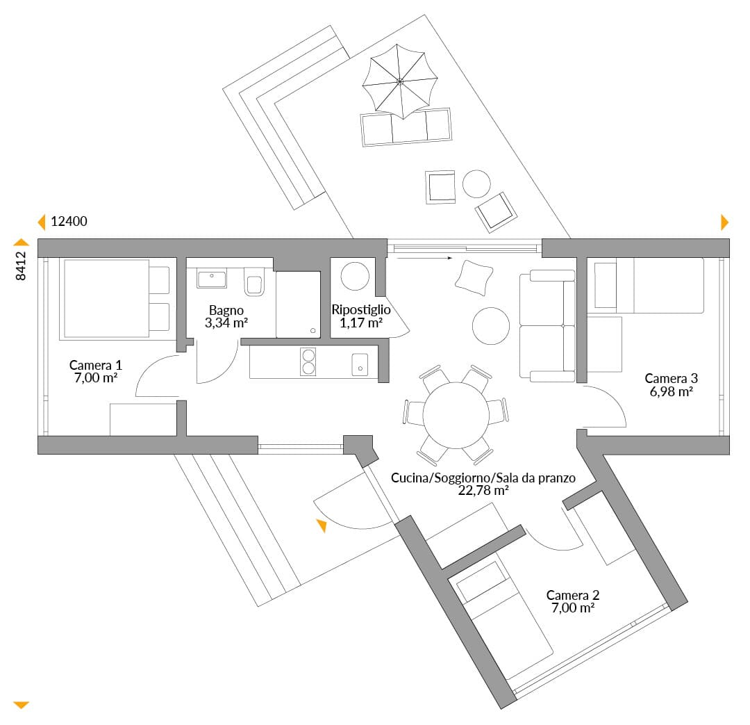 Comfort e funzionalità: Non è necessario avere un pontile privato con accesso diretto al lago per godersi questa spaziosa casa vacanza! Ma anche senza un accesso diretto al lungolago, questa dimora temporanea con moduli più grandi offre numerosi altri vantaggi. I moduli L e un'ala laterale annessa creano ampio spazio per la zona living, pranzo e cucina con accesso alla terrazza. Si ottengono tre camere da letto di dimensioni ragguardevoli con pareti vetrate larghe quasi 4 metri, che permettono di godere a pieno della natura in totale comfort restando comodamente a letto!