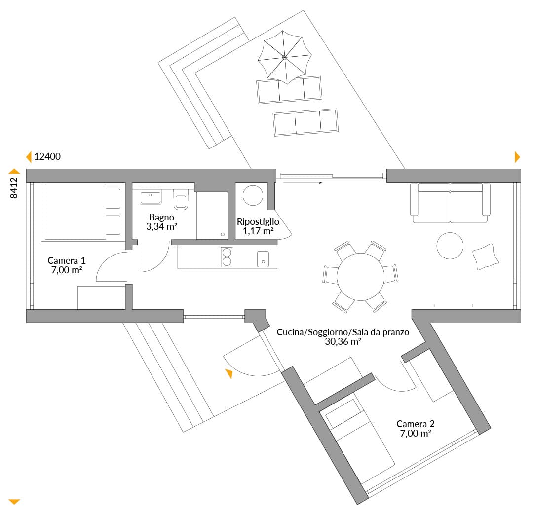 Proprio come a casa: Se si desidera godere del massimo spazio e comfort abitativo nella propria casa vacanza, si consiglia questo rifugio di 49 mq. Ben 30 mq sono dedicati al soggiorno, che invita a prendersi una lunga e rilassante pausa. Le due camere da letto offrono viste panoramiche e persino la cucina è attrezzata per soggiorni prolungati. Questo modello, realizzato con moduli L più ampi, offre molto spazio nella zona living/pranzo ed è pensato per dare lo stesso comfort di casa.