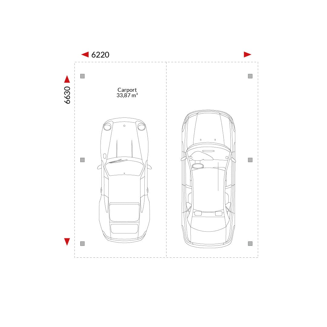 Garage doppio (34,22 m²); tetto a due falde con accesso al timpano; dimensioni esterne 6,23 m x 6,23 m.