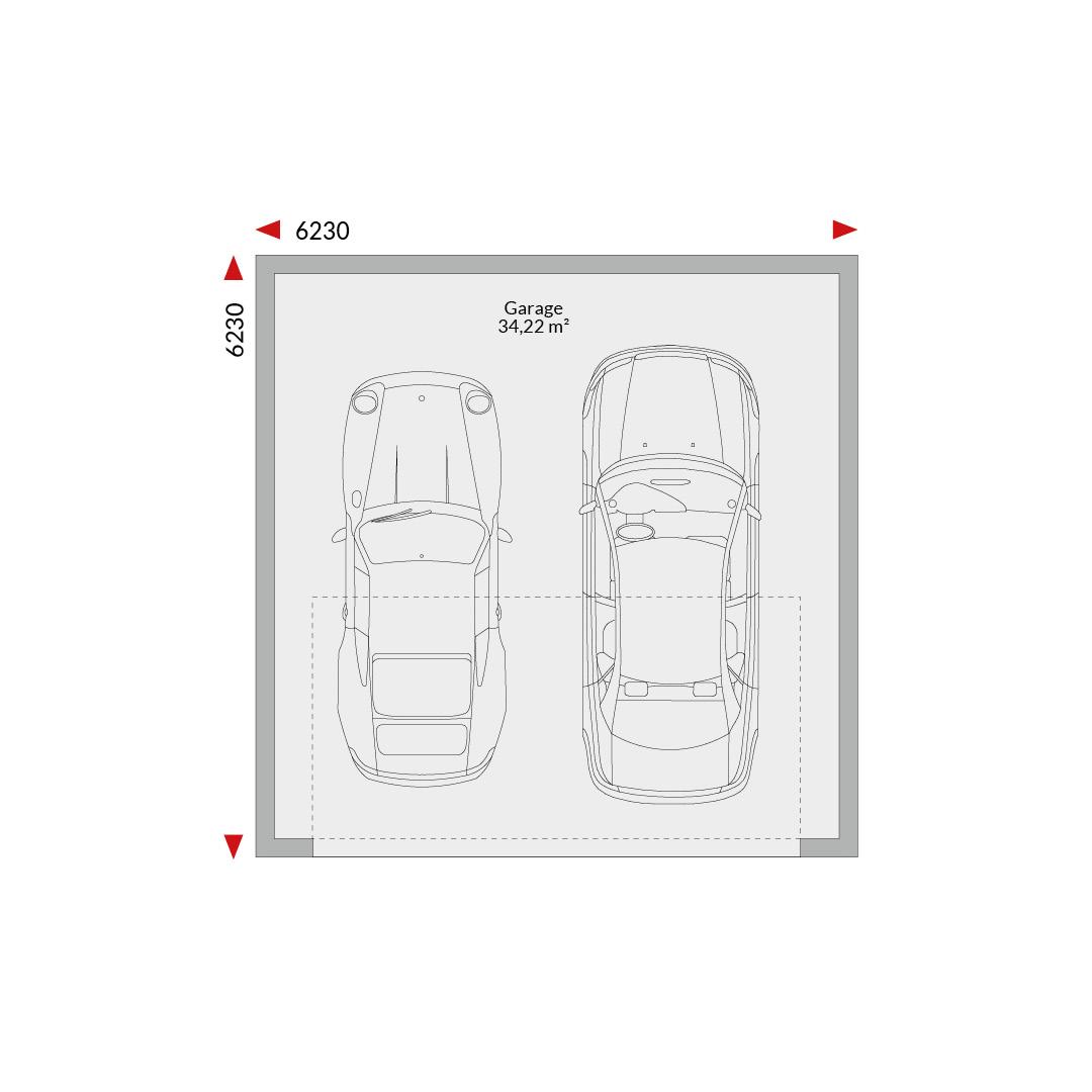 Garage doppio con tetto piano (34,22 m²); dimensioni esterne 6,23 m x 6,23 m.