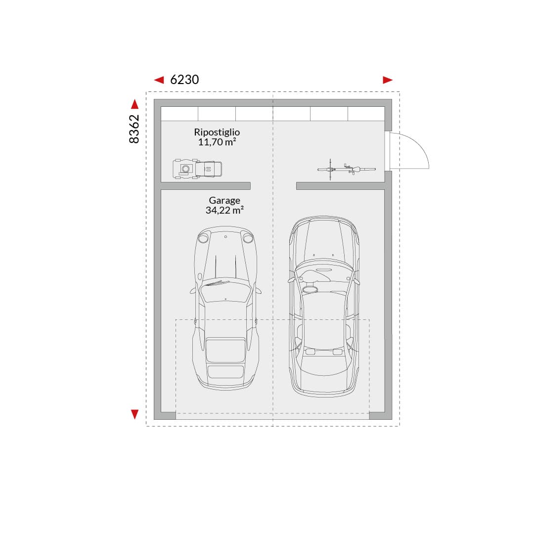 Garage singolo con locale di servizio (29,12 m²); tetto a due falde con accesso al timpano; dimensioni esterne 5,462 m x 6,23 m.
