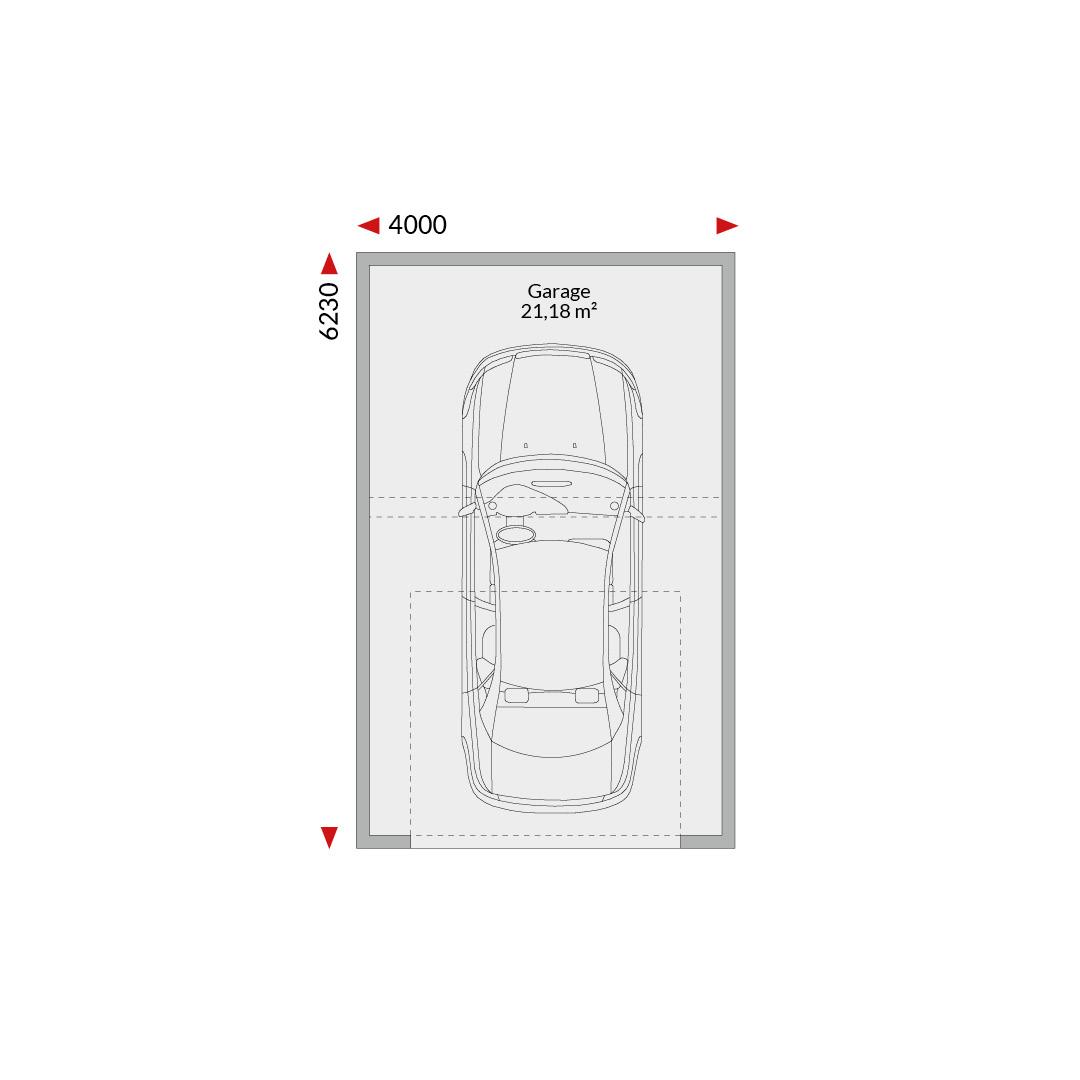 Garage singolo con tetto a falda unica (21,18 m²); dimensioni esterne 4,00 m x 6,23 m.