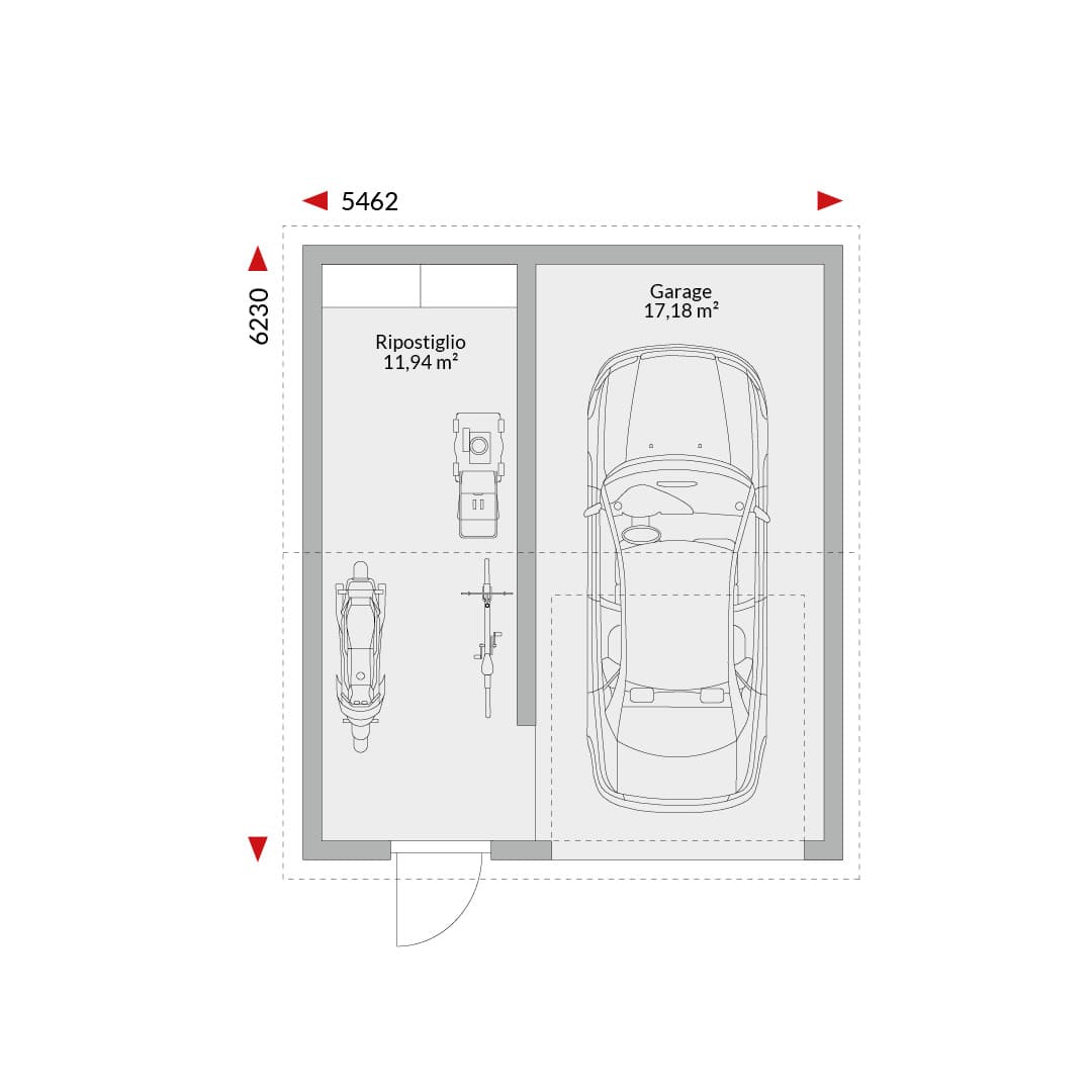 Garage singolo con locale di servizio (29,12 m²); tetto a due falde con accesso al colmo; dimensioni esterne 5,462 m x 6,23 m.