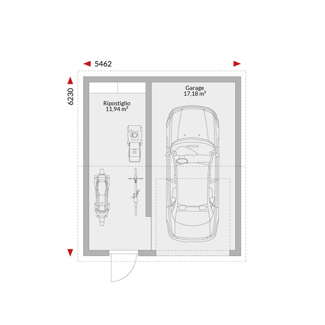 Single garage with utility room (29.12m²); gable roof with access to the eaves; external dimensions 5.462m x 6.23m.