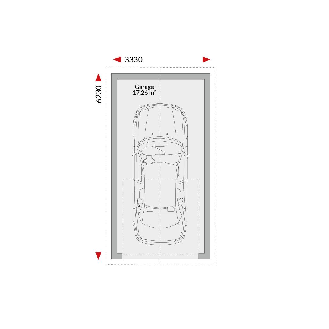 Garage singolo (17,26 m²); tetto a due falde con accesso al colmo; dimensioni esterne 3,33 m x 6,23 m.